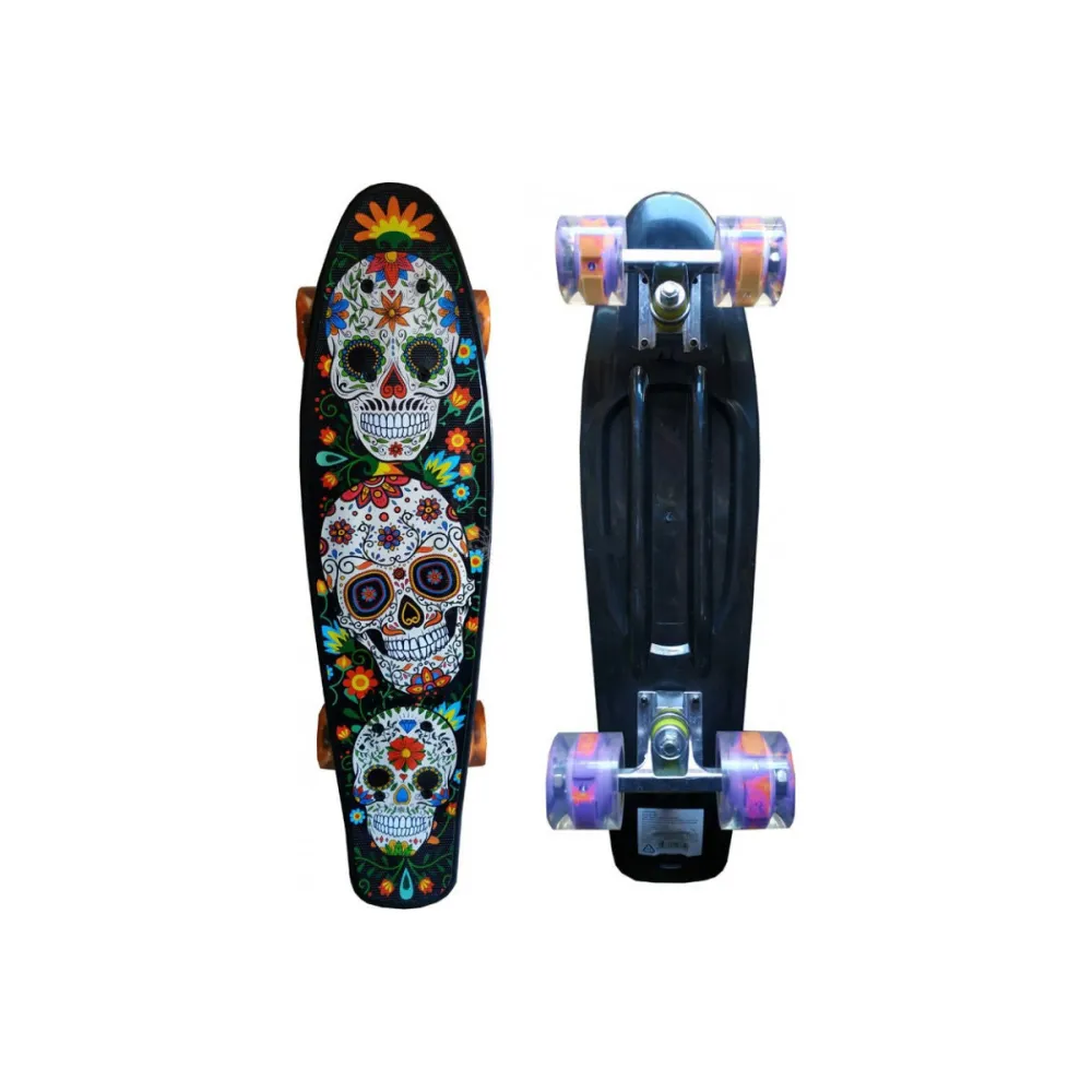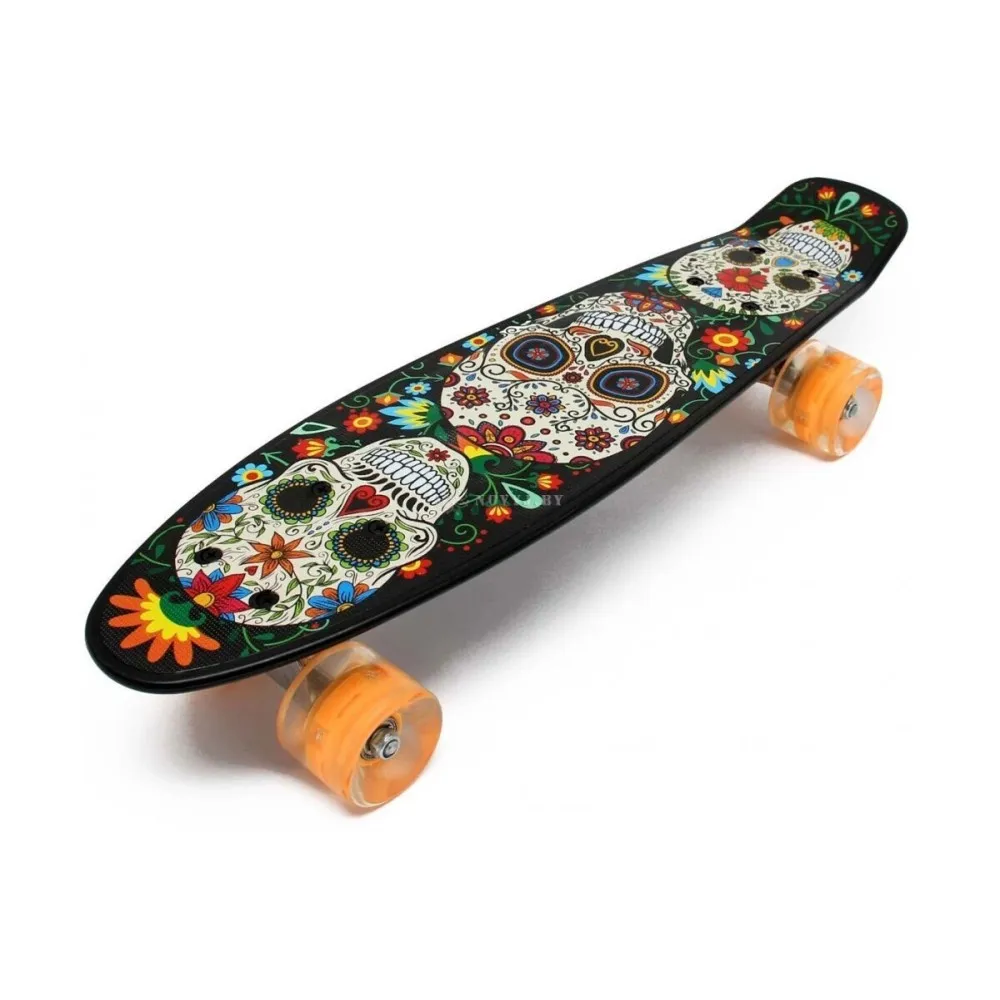 Круизер Черный череп - детская модель скейта весом 1,5 кг удивила пользователей необычным дизайном. Изучение характеристик показало, начиная с дизайна и заканчивая технической частью оформлением и совершенствованием модели занимались профессионалы. Необычный дизайн представлен эксклюзивным рисунком в виде обрамленных в цветных узорах черепов, призывающих разогнаться до максимума и удивить всех.