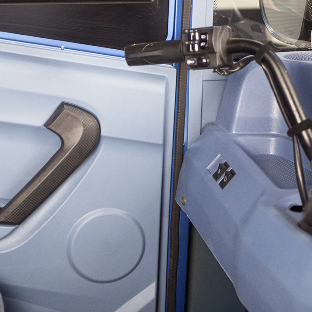 Грузовой электротрицикл Rutrike КАРГО Кабина 1500 60V1000W в темно-синем цвете - это надежное и удобное средство доставки грузов. Он обладает высокой скоростью, большим пробегом и надежным задним тормозом.